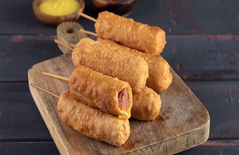 Ρίχνουμε ηλιέλαιο σε ένα βαθύ τηγάνι και τηγανίζουμε τα corn dogs σε δόσεις, ιδανικά στους 160° C, για 3 λεπτά ή μέχρι να πάρουν χρυσαφένιο χρώμα.