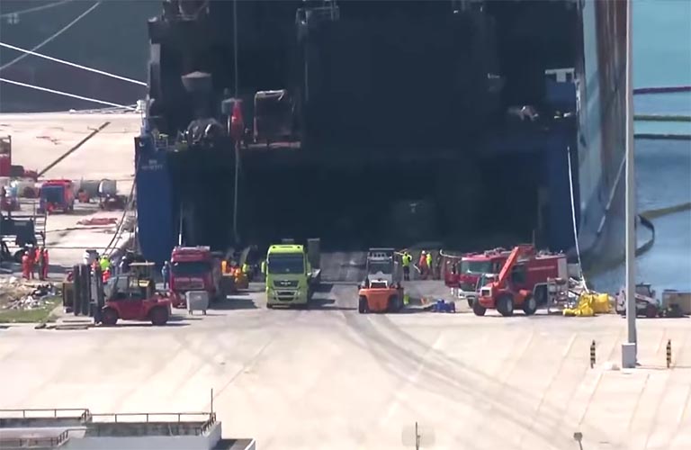 Παράλληλα, συνεχίζονται οι κοπιώδεις προσπάθειες απομάκρυνσης των καμένων και μη οχημάτων, με ισχυρές δύναμεις της Πυροσβεστικής να επιχειρούν στα υπόγεια του καμένου πλοίου. Πρόκειται για μια εξαιρετικά δύσκολη επιχείρηση η οποία γίνεται κάτω από δύσκολες συνθήκες, με ιδιαίτερη προσοχή στην απάντληση υδάτων και μέριμνα για την αποφυγή θαλάσσιας ρύπανσης.