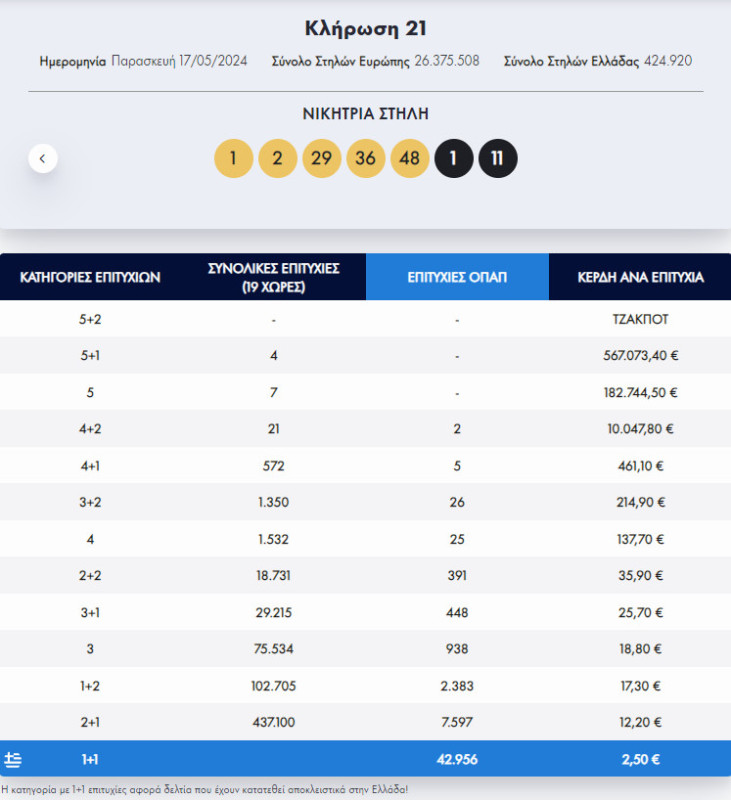 Σε ό,τι αφορά τους νικητές στην Ελλάδα δύο τυχεροί κέρισαν από 10.047,80 ευρώ έχοντας πετύχει τους τέσσερις από τους πέντε και τους δύο επιπλέον αριθμούς.