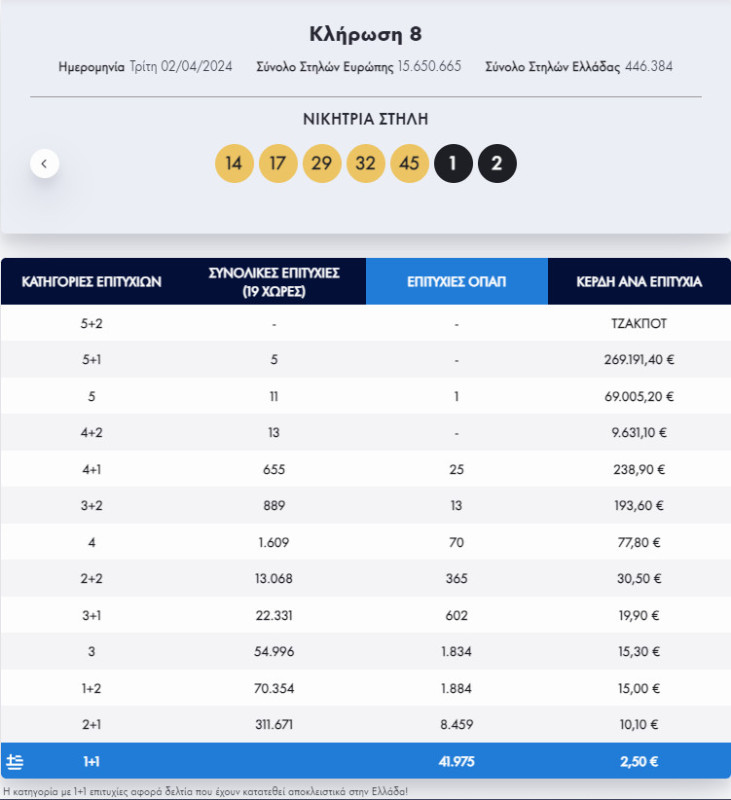 €64.000.000 θα μοιραστούν οι τυχεροί της 1ης κατηγορίας στην κλήρωση της Παρασκευής, 5 Απριλίου 2024 μετά το Τζακ-Ποτ που σημειώθηκε κατά τη σημερινή διαλογή της 8ης κλήρωσης του Eurojackpot.