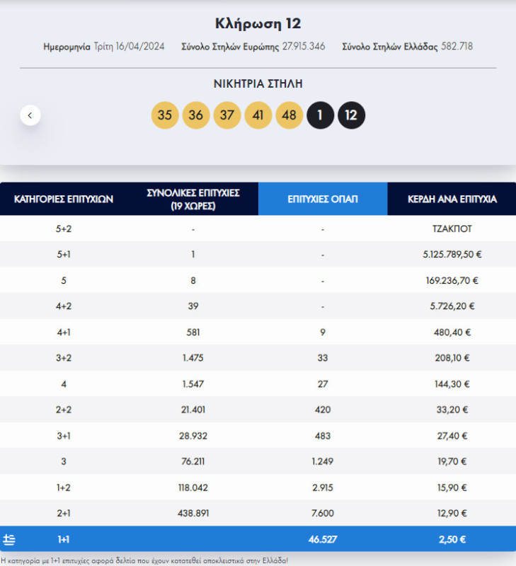 Νέο Mega Τζακ-Ποτ 115 εκατομμυρίων ευρώ σημειώθηκε κατά τη 12η κλήρωση της Τρίτης, 16 Απριλίου 2024 στο Eurojackpot