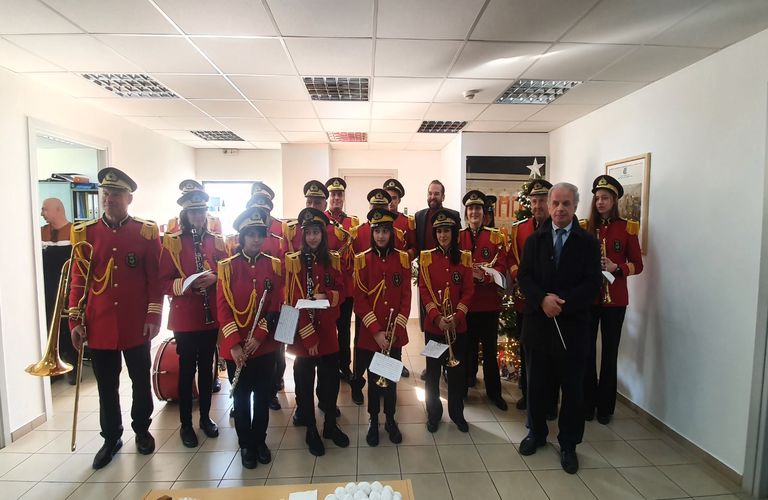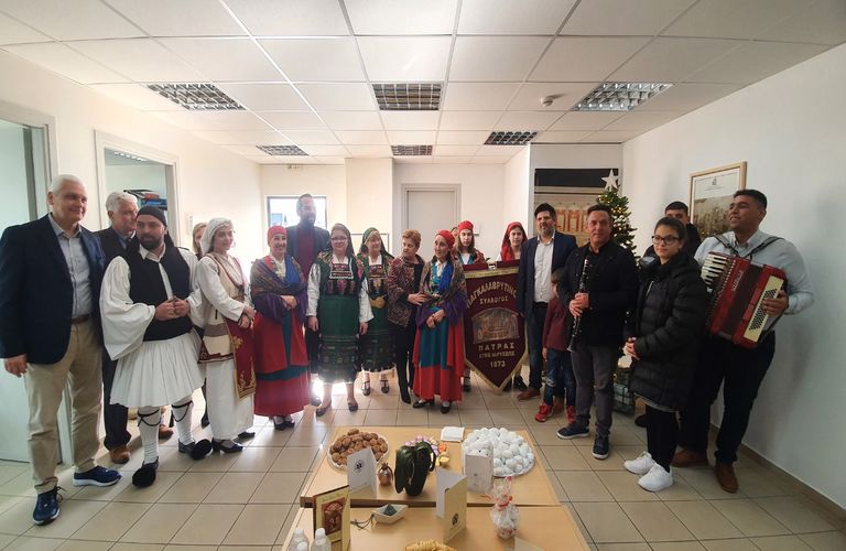 Τέλος, τα κάλαντα έψαλαν στον Περιφερειάρχη και μέλη του Ιστορικού Παγκαλαβρυτινού Συλλόγου Πατρών, οι οποίοι χόρεψαν και σε παραδοσιακούς ρυθμούς.