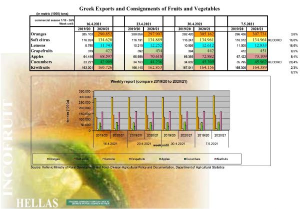 Η εξαγωγή μήλων συνεχίζεται με εκτίμηση του ρυθμού εξαγωγών τους +8,4% (73.109 τ. έναντι 67.422 τ.). Επίσης συνεχίζεται με αυξητικούς ρυθμούς η εξαγωγή φράουλας και από 1/1 έως 7/5/2021 ανήλθαν σε 44.577 τόνους έναντι 34.244 τ. αντίστοιχα πέρυσι.
