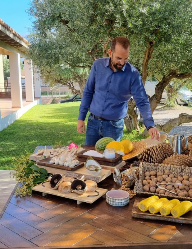 Ένα ξύλινο τραπέζι ανάμεσα σε περήφανες ελιές συγκέντρωνε από το πρωί όλα εκείνα τα προϊόντα που κάνουν την περιοχή μας ξεχωριστή, όπως το αυγοτάραχο Μεσολογγίου, το Πευκόμελο Ερυμάνθου Αχαΐας, οι φράουλες από τη Μανωλάδα Ηλείας και άλλα πολλά, ψητά ή μη.