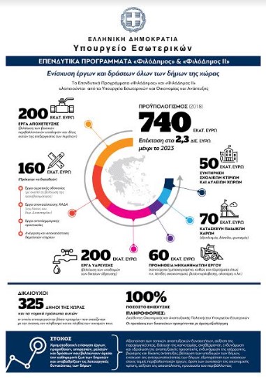 Στο πλαίσιο των Προσκλήσεων των Προγραμμάτων «ΦιλόΔημος» και «ΦιλόΔημος ΙΙ» του Υπουργείου Εσωτερικών, βάσει της Απόφασης 4748 (ΦΕΚ 612/22.2.2018), ο υπουργός Εσωτερικών, Πάνος Σκουρλέτης, ενέκρινε την ένταξη των κάτωθι Πράξεων δήμων συνολικού ποσού ύψους 7.981.987,20 ευρώ με τη συμμετοχή των δήμων να ανέρχεται στο ποσό των 2.628.548,00 ευρώ.