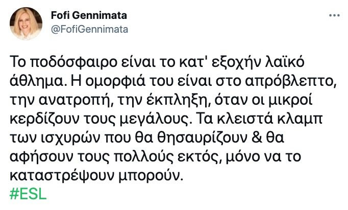 Ανάρτηση της Φώφης Γεννηματά, Προέδρου του Κινήματος Αλλαγής, για την «Ευρωπαϊκή Super League και τις εξελίξεις στο ευρωπαϊκό ποδόσφαιρο.