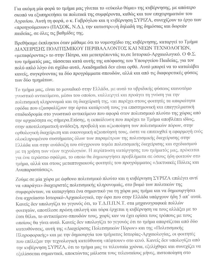 Απόφαση Φοιτητικού Συλλόγου Διαχείρισης Πολιτισμικού Περιβάλλοντος και Νέων Τεχνολογιών: