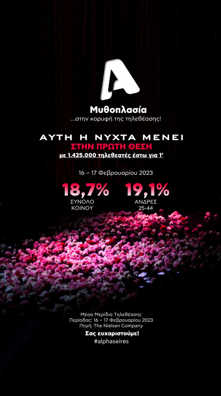 Οι καταιγιστικές εξελίξεις στα δύο τελευταία επεισόδια, 16 και 17 Φεβρουαρίου, έδωσαν στη Νύχτα την πρώτη θέση με 18,7% στο σύνολο του πληθυσμού και τους άνδρες ηλικίας 25-44 να ψηφίζουν Νύχτα σε ποσοστό 19,1%. 1.425.000 τηλεθεατές συντονίστηκαν έστω για ένα λεπτό στη σειρά που δίνει ρυθμό στις νύχτες μας.