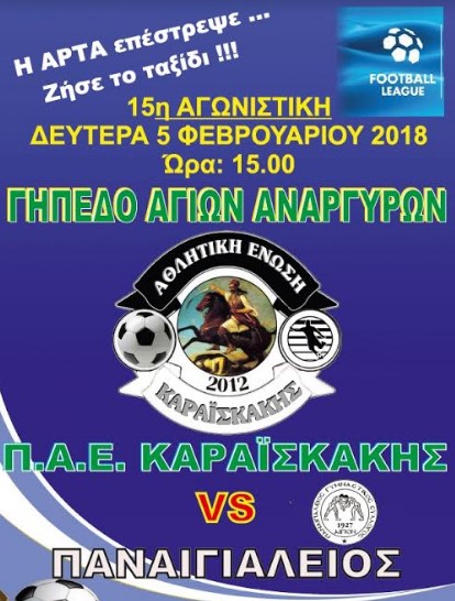 Στο πλαίσιο της 15ης αγωνιστικής του πρωταθλήματος της Football League 2017-2018, η ΠΑΕ Καραϊσκάκης Άρτας θα υποδεχτεί την Δευτέρα 5 Φεβρουαρίου τον Παναιγιάλειο.