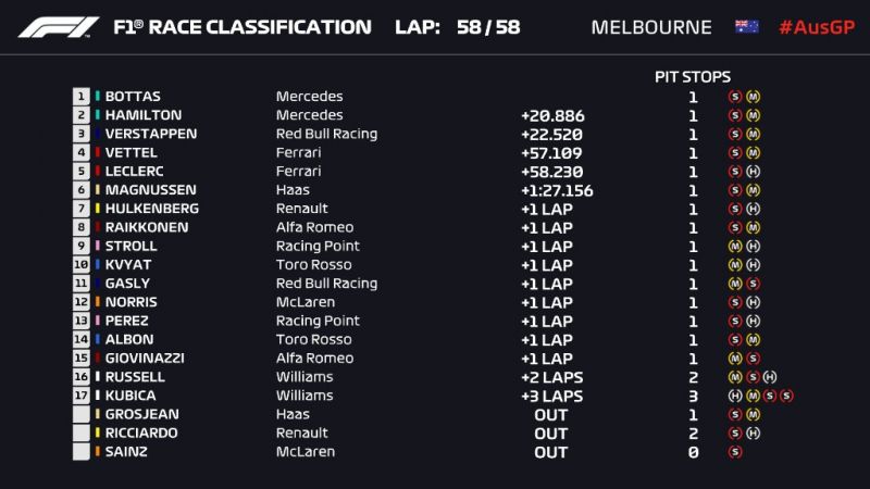 Την πρώτη του νίκη μετά το Νοέμβριο του 2017 και τέταρτη στην καριέρα του πανηγύρισε στη Μελβούρνη ο Βάλτερι Μπότας. Ο Φινλανδός πιλότος της Mercedes πέρασε με την έναρξη τον ομόσταβλό του Λιούις Χάμιλτον, ο οποίος δεν κατάφερε να αξιοποιήσει την pole position που είχε κατακτήσει χθες και τελικά τερμάτισε δεύτερος και με μεγάλη διαφορά.