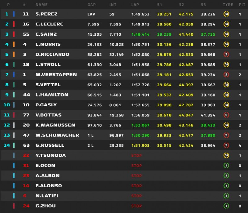 Τη βαθμολογούμενη δεκάδα συμπλήρωσαν οι Λάντο Νόρις με McLaren (4ος), Ντάνιελ Ρικιάρντο με McLaren (5ος), Λανς Στρολ με Aston Martin (6ος), Σεμπάστιαν Φέτελ με Aston Martin (8ος), Λιούις Χάμιλτον με Mercedes (9ος) και Πιέρ Γκασλί με AlphaTauri (10ος).