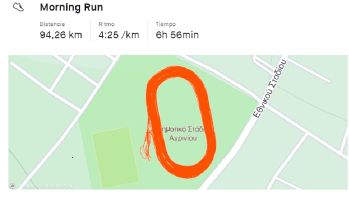 Ο 39χρονος δρομέας από το Αγρίνιο έτρεξε 94.26χλμ., στην πίστα του Δημοτικού Σταδίου της πόλης, όχι γιατί ξαφνικά τρελάθηκε, αλλά για προπόνηση.