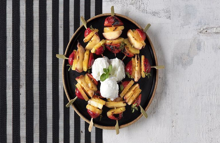 Περνάμε όλα τα κομμάτια των φρούτων εναλλάξ στα ξυλάκια, πασπαλίζουμε με ελαιόλαδο, και ψήνουμε για 4-5 λεπτά από κάθε πλευρά.