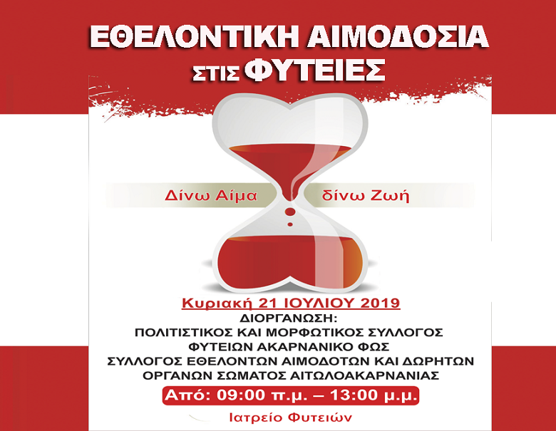 O Πολιτιστικός και Μορφωτικός Σύλλογος Φυτειών σε συνεργασία με το Σύλλογο Εθελοντών Αιμοδοτών και δωρητών οργάνων σώματος Ν. Αιτωλοακαρνανίας και το Γενικό Νοσοκομείο Αγρινίου διοργανώνουν εθελοντική αιμοδοσία την Κυριακή 21 Ιουλίου από τις 09:00 π.μ. έως στις 13:00 μ.μ. στο Ιατρείο Φυτειών.