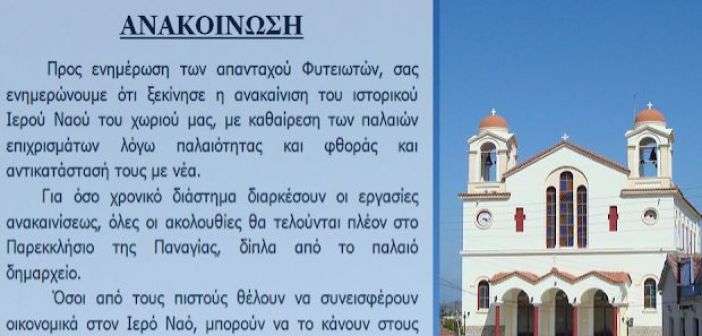 Προς ενημέρωση των απανταχού Φυτειωτών, σας ενημερώνουμε ότι ξεκίνησε η ανακαίνιση του ιστορικού Ιερού Ναού του χωριού μας, με καθαίρεση των παλαιών επιχρισμάτων λόγω παλαιότητας και φθοράς και αντικατάστασή τους με νέα.Για όσο χρονικό διάστημα διαρκέσουν οι εργασίες ανακαινίσεως, όλες οι ακολουθίες θα τελούνται πλέον στο Παρεκκλήσιο της Παναγίας, δίπλα από το παλαιό δημαρχείο. Όσοι από τους πιστούς θέλουν να συνεισφέρουν οικονομικά στον Ιερό Ναό, μπορούν να το κάνουν στους κάτωθι λογαριασμούς: