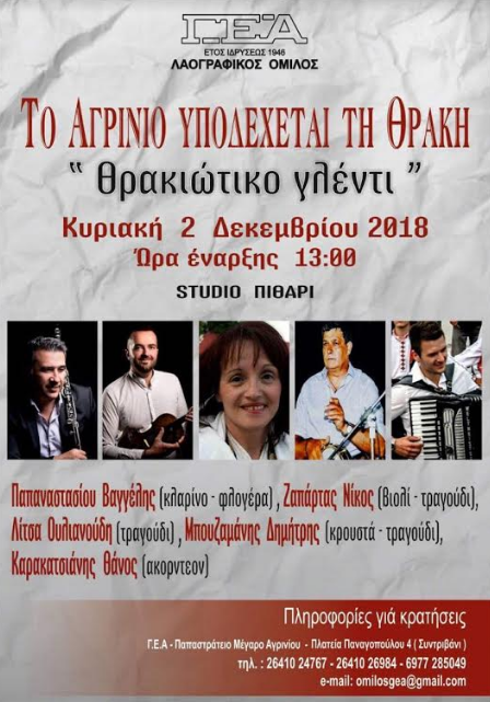 Ο Λαογραφικός Όμιλος της Γυμναστικής Εταιρείας Αγρινίου (Γ.Ε.Α.) διοργανώνει την Κυριακή 2 Δεκεμβρίου 2018 και ώρα 13:00 το μεσημέρι, μεγάλο παραδοσιακό γλέντι με τη συμμετοχή μεγάλης Θρακιώτικης ορχήστρας που την αποτελούν οι:
