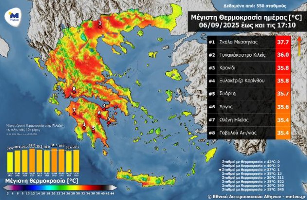 Υψηλές κατά τόπους θερμοκρασίες επικράτησαν στη χώρα το Σάββατο 06/09, με τις μέγιστες τιμές να ξεπερνούν τους 35°C.