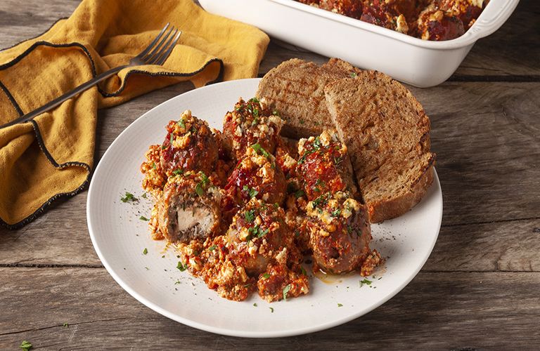 Γεμιστά κεφτεδάκια με φέτα σε σάλτσα ντομάτας