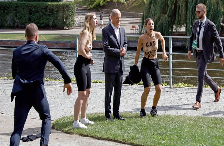 Δύο ακτιβίστριες αιφνιδίασαν τον καγκελάριο της Γερμανίας Όλαφ Σολτς, με τον οποίο ζήτησαν να φωτογραφηθούν, καθώς γύμνωσαν τα στήθη τους απαιτώντας «εμπάργκο στο ρωσικό φυσικό αέριο, τώρα», λόγω της εισβολής της Ρωσίας στην Ουκρανία.