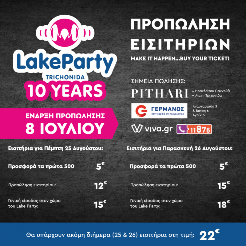 H προπώληση των εισιτηρίων ξεκίνησε! Για να ενημερωθείτε για τις τιμές των εισιτηρίων, τις τρέχουσες προσφορές, τα φυσικά σημεία προπώλησης, αλλά και για κάθε άλλη απαραίτητη πληροφορία επισκεφθείτε το επίσημο site του Lake Party.