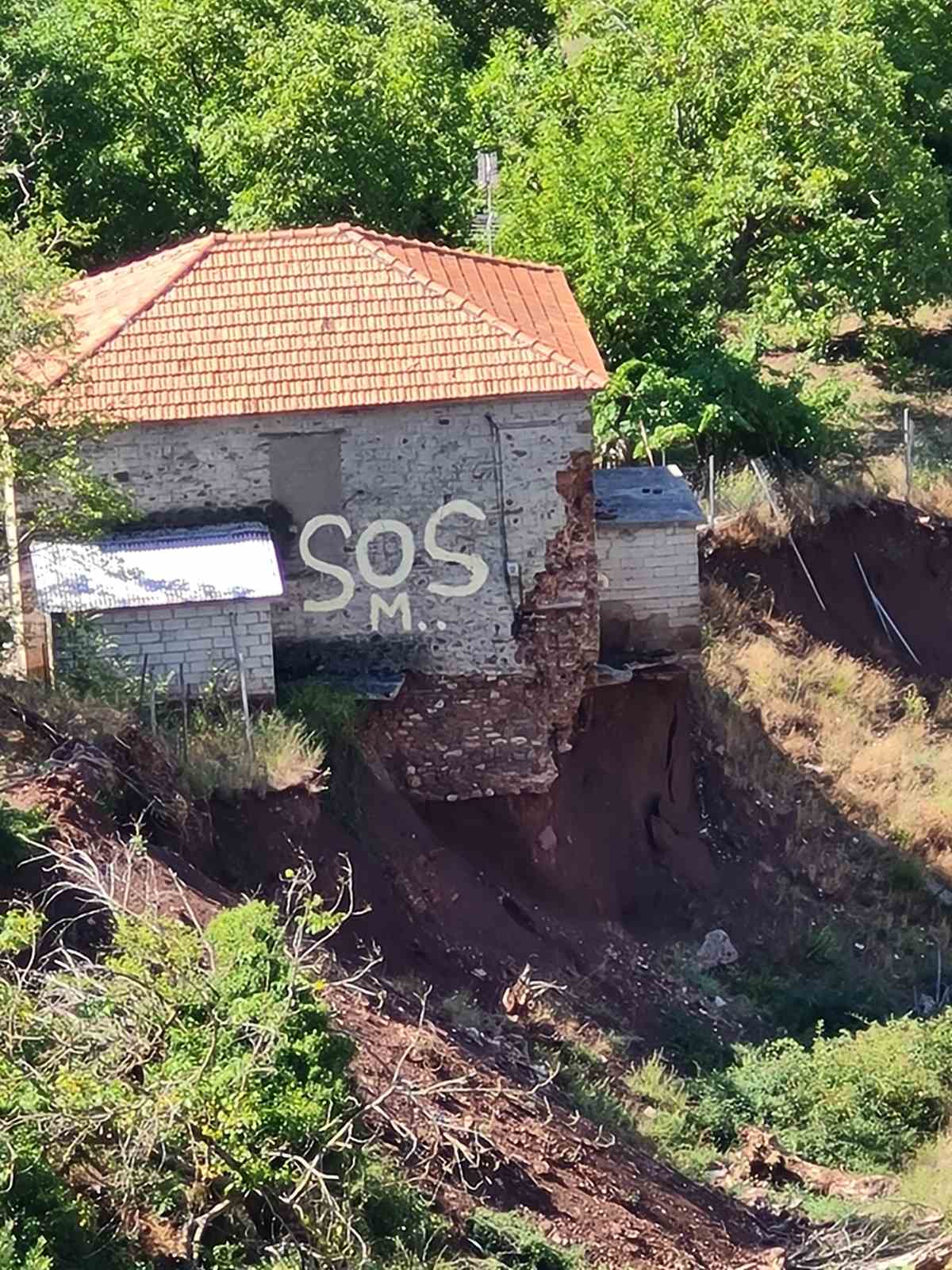 Την κατάσταση της ανασφάλειας στο χωριό υπογραμμίζει παραστατικά η επισυναπτόμενη φωτογραφία, που δείχνει ένα σπίτι να αιωρείται σχεδόν στο κενό. Το SOS που έχει γραφτεί στον τοίχο, το λαμβάνει κανείς;»