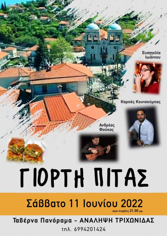 Θα προσφερθούν 9 διαφορετικά είδη Πίτας φτιαγμένες από τις γυναίκες του χωριού ενώ θα υπάρχει ζωντανή μουσική.