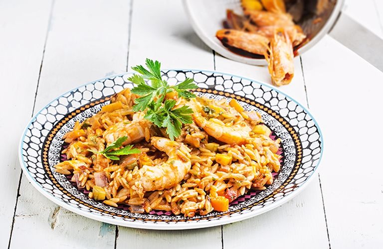 Σερβίρουμε το κριθαράκι και τις γαρίδες με φέτα, ρόκα, ελαιόλαδο, λεμόνι και πιπέρι.