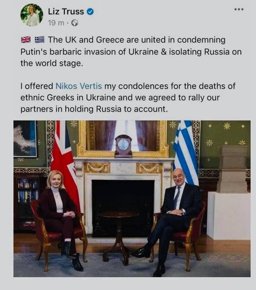 Τον Νίκο Βέρτη τάγκαρε η Βρετανίδα υπουργός εξωτερικών, Λιζ Τρας σε ανάρτησή της στο Facebook μετά το τέλος της συνάντησης που είχε με τον Νίκο Δένδια χθες στο Λονδίνο.
