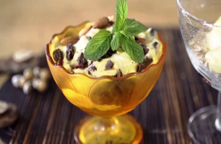 - Σερβίρουμε το παγωτό μας σε ένα ποτήρι, βάζοντας μία στρώση δημητριακά, μερικές κουταλιές παγωτό, ξηρούς καρπούς και κράνμπερις και φύλλα μέντας.