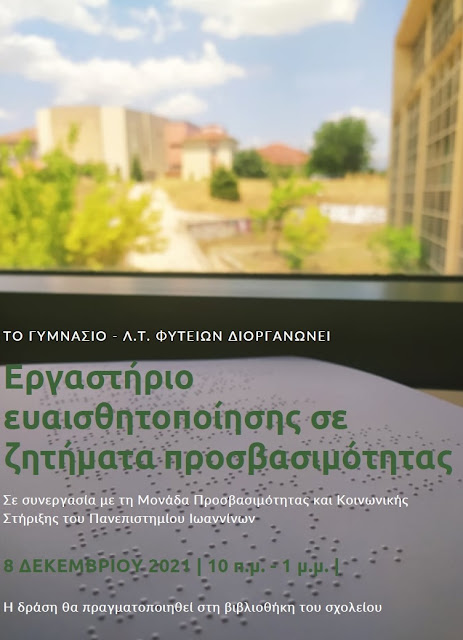 Η 3η Δεκεμβρίου έχει οριστεί ως Παγκόσμια Ημέρα Ατόμων με Αναπηρία. Με σκοπό την ευαισθητοποίηση της σχολικής μας κοινότητας επί ζητημάτων ισότιμης πρόσβασης των ατόμων με αναπηρία στην εκπαίδευση, το Γυμνάσιο – Λ.Τ. Φυτειών, σε συνεργασία με τη Μονάδα Προσβασιμότητας και Κοινωνικής Στήριξης του Πανεπιστημίου Ιωαννίνων, διοργανώνουν για την Τετάρτη 8 Δεκεμβρίου 2021, εργαστηριακό κύκλο σεμιναρίων με τον ειδικότερο τίτλο: