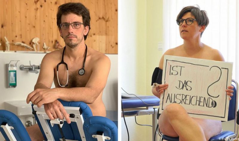 Έτσι και οι Γερμανοί γιατροί πόζαραν μέσα ή έξω από τα ιατρεία τους γυμνοί ή μόνο με μάσκες, στηθοσκόπια ή μηχανήματα που μετράνε την πίεση. Εντελώς γυμνοί δεν ήταν πάντως. Οι ευαίσθητες περιοχές καλύπτονταν από ένα τραπέζι, μια καρέκλα ή κάτι άλλο. Το κείμενο που συνοδεύει τις φωτογραφίες γράφει: «Όταν μας τελειώσουν και τα λίγα που διαθέτουμε, τότε θα μείνουμε έτσι». Χωρίς προστασία νιώθουν ευάλωτοι.