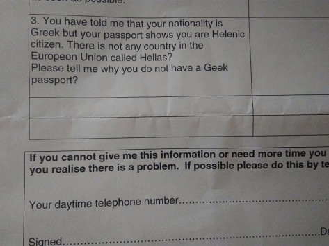 Σύμφωνα με τον Γιώργο Ζαχαρόπουλο πρόκειται για επιστολή που εστάλη σε Έλληνα από το δημοτικό συμβούλιο του Μάντσεστερ! Γράφει λοιπόν η επιστολή: «Μου είπατε ότι η εθνικότητά σας είναι ελληνική (Greek) αλλά το διαβατήριό σας δείχνει πως είστε Έλληνας πολίτης (Hellenic citizen). Δεν υπάρχει κάποια χώρα στην Ευρωπαϊκή Ένωση που να λέγεται Ελλάς (Hellas); Παρακαλώ πείτε μου γιατί δεν έχετε ελληνικό (Greek) διαβατήριο».