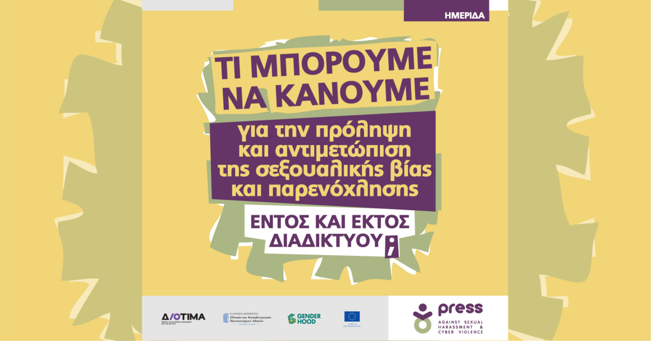 To Genderhood, το Κέντρο Διοτίμα και το Τμήμα Επικοινωνίας και ΜΜΕ του ΕΚΠΑ διοργανώνουν ημερίδα για την πρόληψη και αντιμετώπιση της σεξουαλικής βίας και παρενόχλησης εντός και εκτός διαδικτύου, την Πέμπτη 18/01/2024, 11:00 – 13:00, στο Σεράφειο του Δήμου Αθηναίων (Εχελιδών & Πειραιώς 144, Αθήνα).