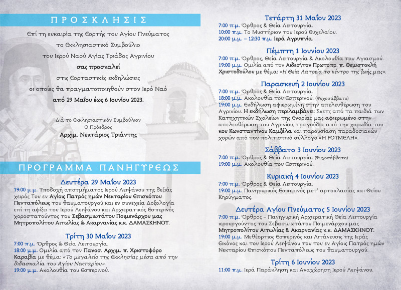 19:00 Μεθέορτος Εσπερινός και Λιτάνευσις της Ιεράς Εικόνος και του Ιερού Λειψάνου του του εν Αγίοις Πατρός ημών Νεκταρίου Επισκόπου Πενταπόλεως του θαυματουργού.