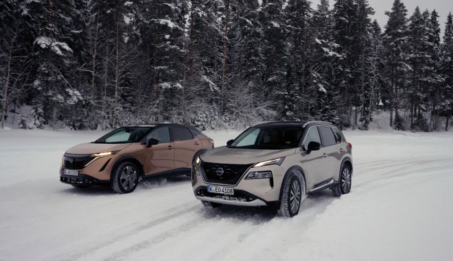 Σχεδιασμένο με ακρίβεια, το e-4ORCE δίνει τη δυνατότητα στους οδηγούς να διασχίζουν αβίαστα τις πιο δύσκολες συνθήκες με ευκολία και σιγουριά. Επιδεικνύοντας τις απαράμιλλες δυνατότητες της τεχνολογίας σε παγωμένα εδάφη, το X-Trail e-POWER e-4ORCE και το 100% ηλεκτρικό Ariya e-4ORCE διασχίζουν ομαλά διαδρομές εντός και εκτός δρόμου καθώς και μια συναρπαστική διαδρομή πάνω σε παγωμένες λίμνες με φόντο το περίφημο Βόρειο Σέλας.