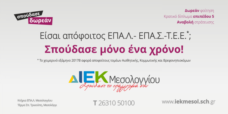 Για περισσότερες πληροφορίες οι ενδιαφερόμενοι μπορούν να απευθύνονται στη Γραμματεία του ΔΙΕΚ Μεσολογγίου 26310 50100.