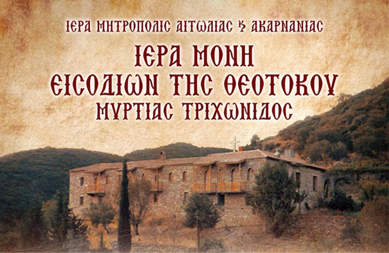 Τη Δευτέρα 21 Νοεμβρίου 2022 πανηγυρίζει η Ιερά Βυζαντινή Μονή Μυρτιάς Τριχωνίδος την μεγάλη θεομητορική εορτή των Εισοδίων της Υπεραγίας Θεοτόκου, που αποτελεί και την κύρια πανήγυρη της Μονής.