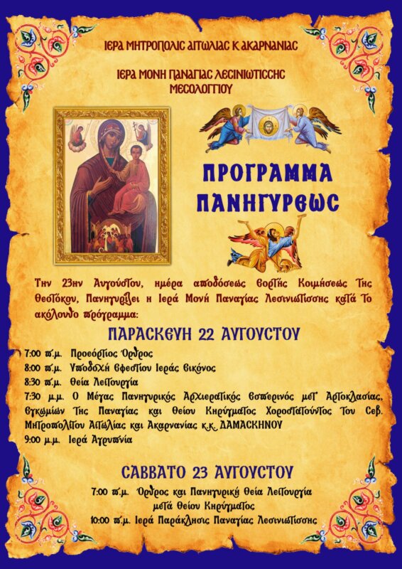 Το Σάββατο, 23 Αυγούστου, ημέρα αποδόσεως εορτής Κοιμήσεως της Θεοτόκου, πανηγυρίζει η Ιερά Μονή Παναγίας Λεσινιώτισσας κατά το ακόλουθο πρόγραμμα:
