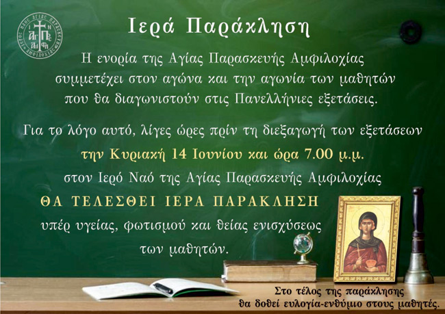 Η ενορία της Αγίας Παρασκευής Αμφιλοχίας συμμετέχει στον αγώνα και την αγωνία των μαθητών που θα διαγωνιστούν στις Πανελλήνιες εξετάσεις. Για το λόγο αυτό, λίγες ώρες πριν τη διεξαγωγή των εξετάσεων την Κυριακή 14 Ιουνίου και ώρα 07:00 μ.μ. στον Ιερό Ναό Αγίας Παρασκευής Αμφιλοχίας θα τελεσθεί Ιερά Παράκληση υπέρ υγείας, φωτισμού και θείας ενισχύσεως των μαθητών.