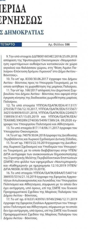 Σήμερα είμαι στην εξαιρετικά ευτυχή θέση να ανακοινώσω την Έγκριση του γενικού σχεδιασμού της Μαρίνας Παλαίρου του Δήμου Ακτίου – Βόνιτσας». Έχει ήδη ολοκληρωθεί με επιτυχία η χωροθέτηση της μαρίνας, στα πλαίσια του Ν.2160/93. Επιπροσθέτως, δημοσιεύτηκε στο ΦΕΚ 598/Δ/21.09.2022 το Προεδρικό Διάταγμα (Π.Δ.), αφού είχε προηγηθεί η σύμφωνη γνώμη του ΣΤΕ. Για να γίνει αντιληπτό το πόσο σημαντικό έργο επιτυγχάνεται για το νομό, σήμερα μόνο δύο μαρίνες σε όλη την Ελλάδα έχουν ολοκληρώσει τις σχετικές διαδικασίες, που απαιτούνται, και αυτές είναι η μαρίνα της Παλαίρου και η μαρίνα της Σαντορίνης.