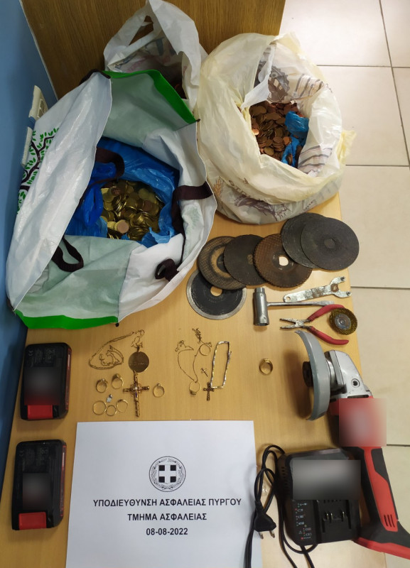 Ειδικότερα, οι αστυνομικοί της Υποδιεύθυνσης Ασφάλειας Πύργου, εντόπισαν σε στοχευμένο έλεγχο τον κατηγορούμενο να κινείται με αυτοκίνητο και σε έρευνα που του ενήργησαν βρήκαν στην κατοχή του και κατέσχεσαν τρεις σακούλες, που περιείχαν το χρηματικό ποσό των 1.705 ευρώ σε κέρματα αξίας από πέντε λεπτά του ευρώ μέχρι και δύο ευρώ, καθώς και πληθώρα εργαλείων εντός του οχήματός του, όπως ηλεκτρικό τροχό κοπής, δίσκοι κοπής μετάλλου, πένσα, μπουζόκλειδο και άλλα.