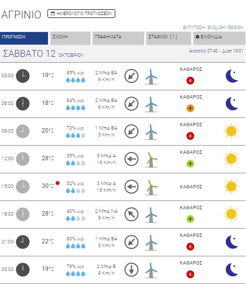 Ηλιοφάνεια με λίγες νεφώσεις, αυξημένες στα ανατολικά με πιθανότητα τοπικών βροχών τις πρωινές ώρες στην Κεντρική Μακεδονία και ενισχυμένους βόρειους ανέμους στο Αιγαίο περιμένουμε το Σάββατο 12 Οκτωβρίου 2019.