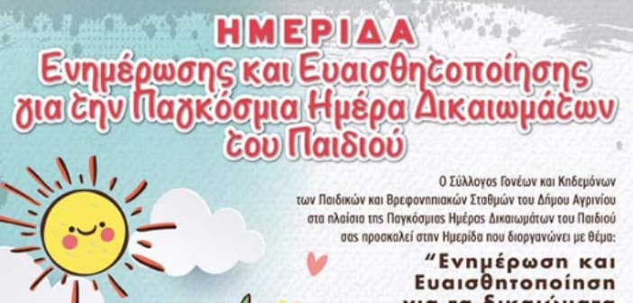 Ο Σύλλογος Γονέων και Κηδεμόνων των Παιδικών και Βρεφονηπιακών Σταθμών του Δήμου Αγρινίου, στο πλαίσιο της Παγκόσμιας Ημέρας Δικαιωμάτων του Παιδιού που εορτάζεται στις 20 Νοεμβρίου, διοργανώνει ημερίδα ενημέρωσης και ευαισθητοποίησης για τα δικαιώματα του παιδιού την Κυριακή 24 Νοεμβρίου στις 18.00, στην παλαιά Λαχαναγορά. Προσκαλεί όλους, γονείς, εκπαιδευτικούς και κάθε ενδιαφερόμενο να παρακολουθήσει τις ενδιαφέρουσες ομιλίες των ειδικών.