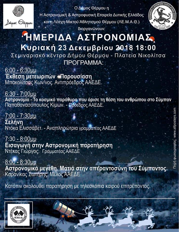 Ο Δήμος Θέρμου, η Λέσχη Μικτού Αθλητισμού Θέρμου (ΛΕ.ΜΑ.Θ) και η Αστρονομική και Αστροφυσική Εταιρεία Δυτικής Ελλάδας (Α.Α.Ε.Δ.Ε.), συνδιοργανώνουν την 23η Δεκεμβρίου 2018 ημέρα Κυριακή στις 18:00 στο σεμιναριακό κέντρο Δήμου Θέρμου – πλατεία Νικολίτσα, ημερίδα με παρουσιάσεις – ομιλίες σχετικά με την Αστρονομία.