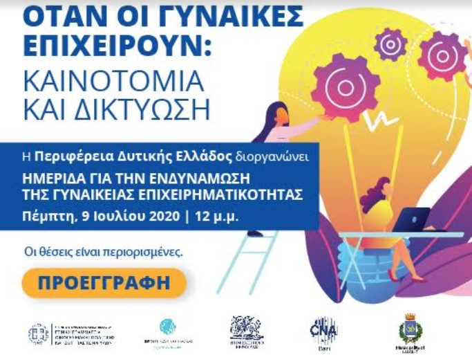 Στο πλαίσιο υλοποίησης του ευρωπαϊκού έργου ICON WOM-EN – “Integrating Innovation and Promoting Cluster Organization in WOMen Enterprises”, η Περιφέρεια Δυτικής Ελλάδος διοργανώνει την Πέμπτη 9 Ιουλίου 2020, στις 12 το μεσημέρι διαδικτυακή ημερίδα με θέμα την προώθηση και ενδυνάμωση της γυναικείας επιχειρηματικότητας.