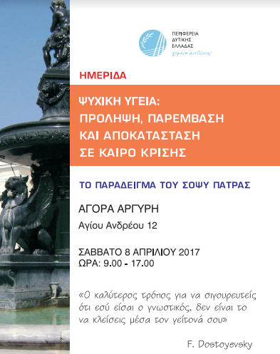 Ο Σύλλογος για τη Ψυχική υγεία – ΣΟΨΥ Πάτρας σε συνεργασία με την Περιφέρεια Δυτικής Ελλάδας διοργανώνουν ημερίδα με θέμα «Ψυχική Υγεία: Πρόληψη, Παρέμβαση και Αποκατάσταση σε καιρό κρίσης. Το παράδειγμα του ΣΟΨΥ Πάτρας».