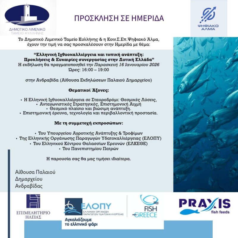 Ημερίδα αναμένεται να πραγματοποιηθεί στη Δυτική Ελλάδα για την Ιχθυοκαλλιέργεια και την τοπική ανάπτυξη, υπό την πρωτοβουλία της Δρ. Διονυσίας Αυγερινοπούλου και με χορηγία της ΕΛ.Ο.Π.Υ.