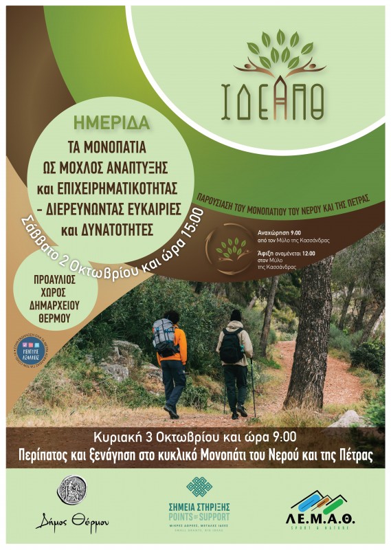 Το Ινστιτούτο Δημιουργικότητας Έρευνας και Ανάπτυξης Περιφέρειας Θέρμου (Ι.Δ.Ε.Α.Π.Θ.) με αφορμή την υλοποίηση του προγράμματος των Σημείων Στήριξης που χρηματοδοτείται από το ίδρυμα COSTA M. LEMOS και σε συνεργασία με τον Δήμο Θέρμου, διοργανώνει διήμερες εκδηλώσεις:
