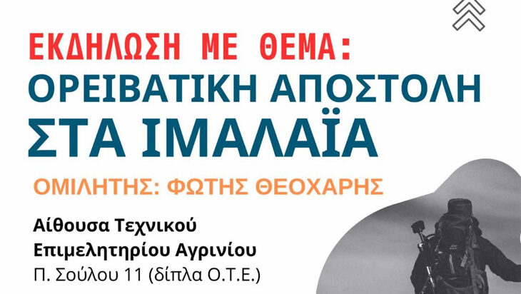 Εκδήλωση με θέμα «oρειβατική αποστολή στα Ιμαλάια» διοργανώνει ο Ορειβατικός Σύλλογος Αγρινίου.