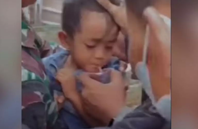 Μέλος σωστικού συνεργείου, χαμογελώντας πλατιά, παίρνει αγκαλιά το παιδί, που φοράει μπλουζάκι και μπλε παντελόνι, ενώ δεύτερο κρατάει το χέρι του αγοριού στο βίντεο, που δημοσιοποιήθηκε από την αυτοδιοίκηση στην Μπόγκορ, στη δυτική Ιάβα.